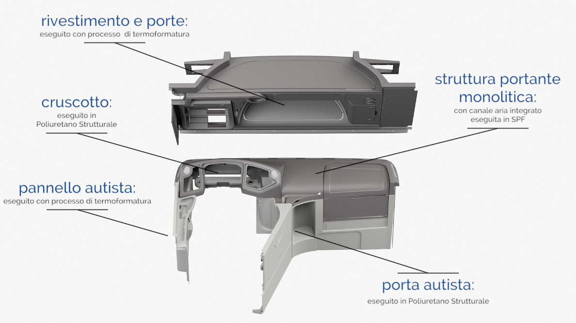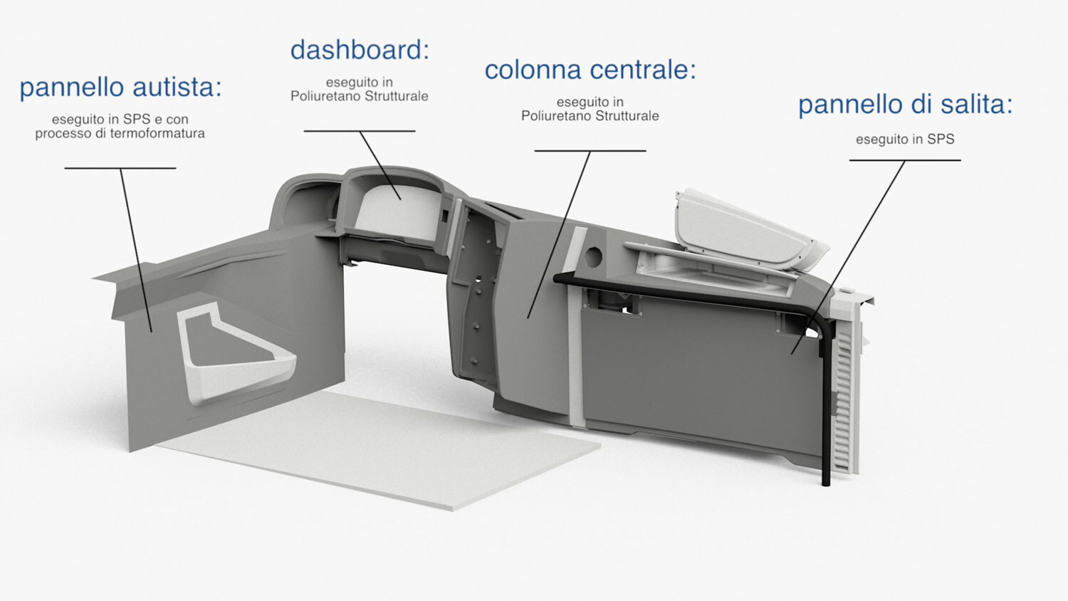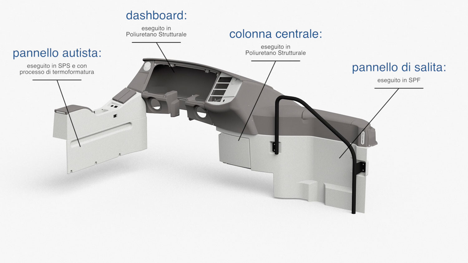 Cruscotti e finizioni per cabine autobus urbani realizzati in PUR iniettato e in PUR spruzzato con canale aria, portelli di copertura e pannelli in ABS termoformato, completi di specifici elementi metallici strutturali e con sportello autista in PUR strutturale.